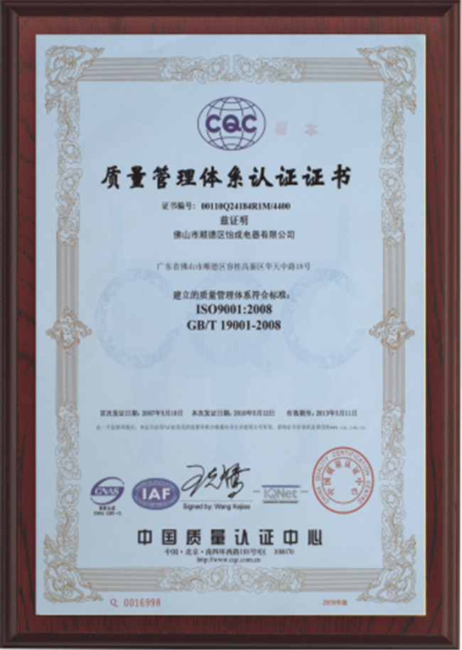 企業(yè)通過IS09001:2000國際體系認證,并全面嚴格按照IS09001:2000體系進行運營管理。企業(yè)是中國土木工程學(xué)會燃氣分會會員單位、廣東家電商會會員單位、順德燃氣具商會會員單位、順德家電商會會員單位,公司是國家出口產(chǎn)品二類企業(yè),公司主要產(chǎn)品出口北美和歐洲地區(qū),公司一貫堅持質(zhì)量、信譽至上...